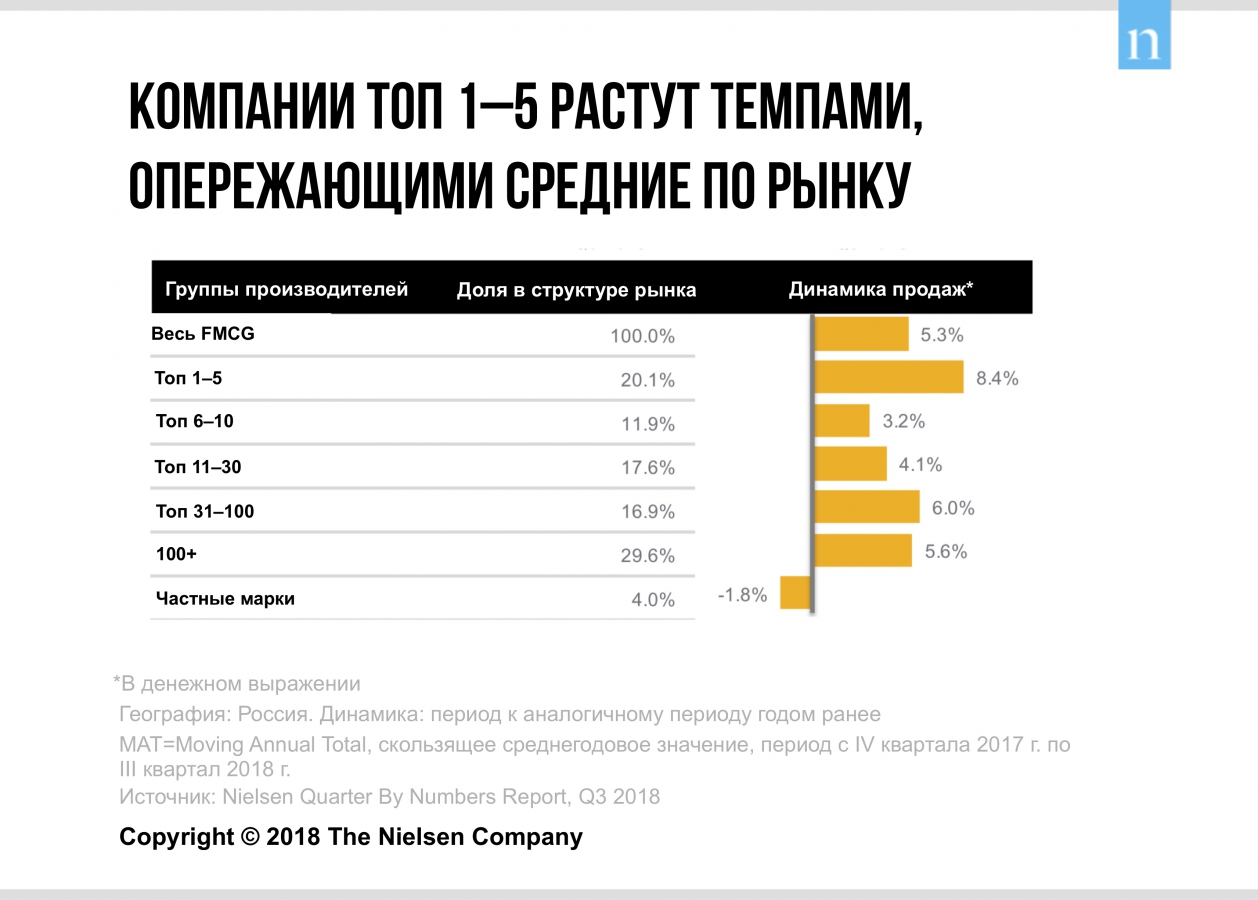 Игроки топ-1−5 в третьем квартале 2018 года показали наибольший прирост продаж в денежном выражении среди производителей FMCG-товаров. Их суммарная выручка выросла на 8,4%. В совокупности на них приходится 20,1% роста всего FMCG-рынка в денежном выражении. Динамика продаж частных марок продолжила снижение на -1,8%. Единственным регионом, показавшим положительную динамику продаж СТМ оказался Дальний Восток, где уровню пенетрации частных марок еще есть куда расти. В остальных регионах производители известных брендов делают потребителям более привлекательные предложения за счет промоактивности и работы с ценой.