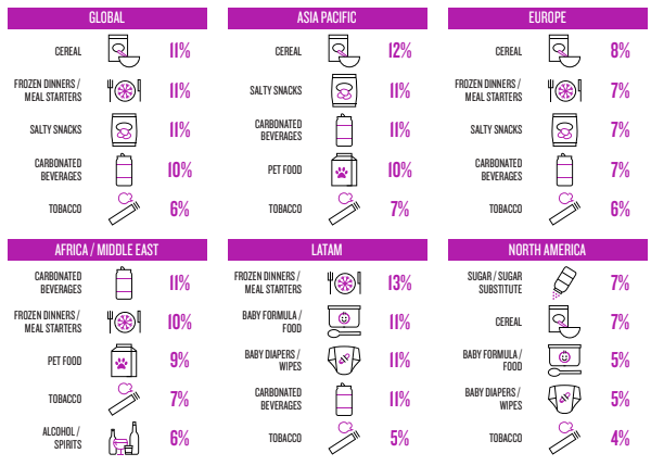 Европейский TOП-5 полностью совпал с глобальным, и возглавляют его «Сухие завтраки». Среди товаров, за которые люди не любят доплачивать, соленые снэки, замороженные продукты, иногда еда для детей, иногда для животных, а также газировка и сахар. Замыкают TOП-5 «товары порока» (vice): в Африке — алкоголь, во всех остальных регионах — табачные изделия.