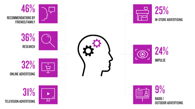 Говоря о премиальных товарах, нельзя не сказать о том, как информация о них попадает к потребителям. Классическая модель ранжирования коммуникационных каналов сегодня не годится: все смотрят и слушают всё — цифровизация! В итоге такой классический канал распространения информации, как телевидение сравнялся по актуальности с онлайн-рекламой (31% и 32%, соответственно). Радио и наружная реклама оказались в конце списка — по 9%. А возглавляют его MOW — рекомендации родственников, друзей и знакомых (46%) и самостоятельный поиск в интернете (36%). Но, повторимся, речь идет не о массовых дешевых товарах, а о продукции премиального качества, решение о покупке которой редко принимается «вдруг». Впрочем, и так тоже — это отметил каждый четвертый респондент.