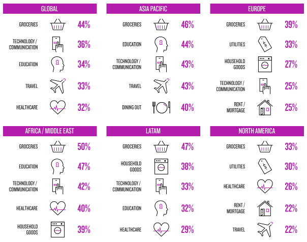 Люди — везде люди. И везде ведущая статья расхода у них одинакова: продукты питания. Дальше начинаются различия, хотя не сказать, чтобы большие. Так, на второй позиции у европейцев и североамериканцев стоят услуги ЖКХ, а у жителей Азиатско-Тихоокеанского региона и Африки — образование.