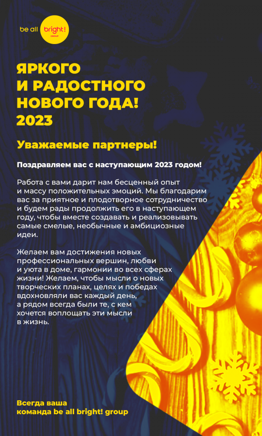 Желаем, чтобы Новый год был наполнен не менее яркими красками, безудержной энергией и вдохновением! Пусть вас окружают самые близкие по духу люди! В 2022-ом мы остро почувствовали, насколько важны в нашем турбулентном мире крепкие дружеские и деловые связи, и искренне благодарим наших стратегических партнёров за то, что прошли этот год с нами рука об руку. Хороших новогодних праздников и продуктивной работы в новом году!