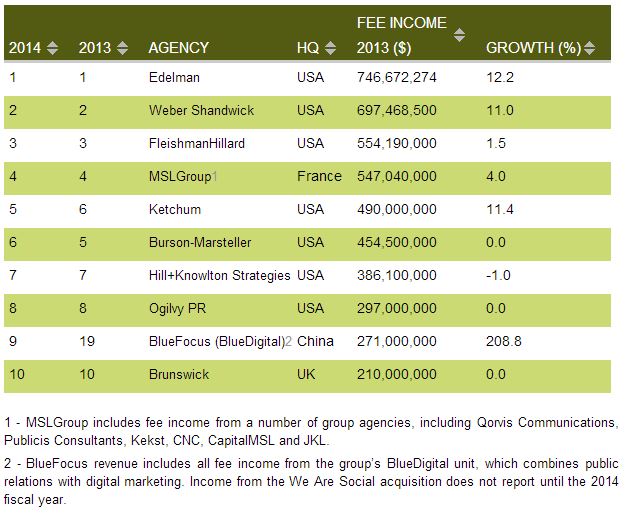 Лидерами TOP-250 стали Edelman с выручкой 746,7 млн долларов, Weber Shandwick (697,5 млн), FleishmanHillard (554,2 млн), MSLGroup (547 млн), Ketchum (490 млн), Burson-Marsteller (454,5 млн), Hill+Knowlton Strategies (386,1 млн), Ogilvy PR (297 млн).