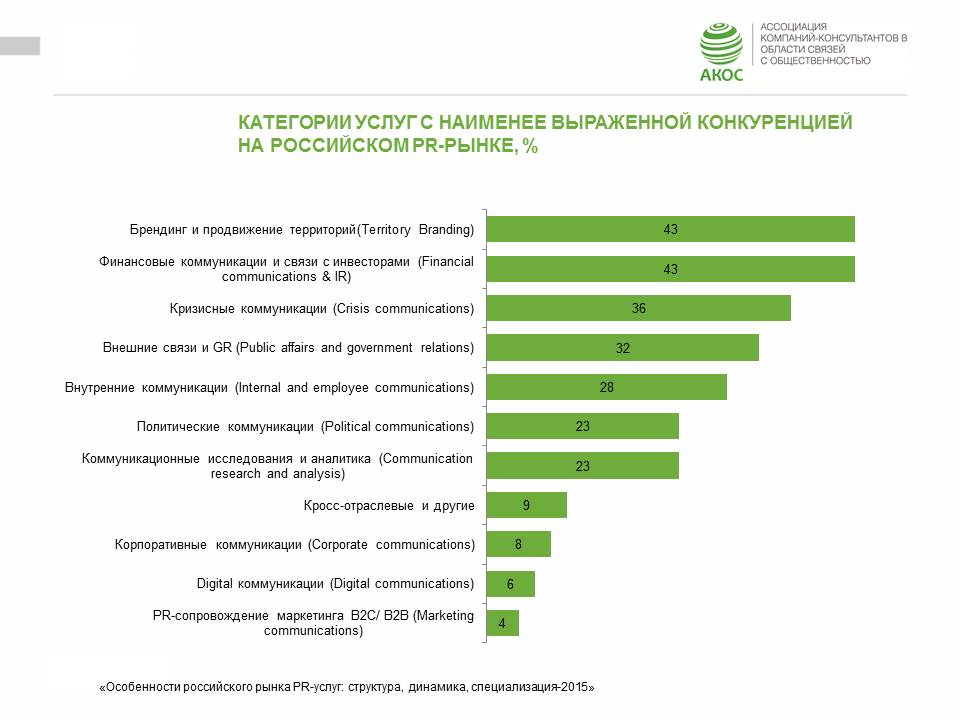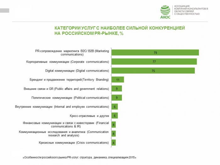 Самой медленно растущей по доходам категорией являются политические коммуникации. К наименее конкурентным категориям эксперты отнесли кризисные коммуникации, финансовые коммуникации и связи с инвесторами, а также брендинг и продвижение территорий.