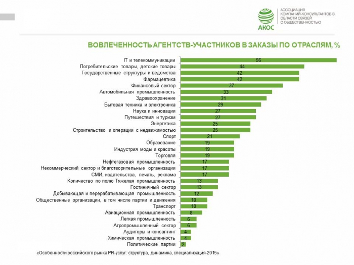 Больше всего заказов участники исследования получали от таких отраслей, как IT и телекоммуникации, потребительские и детские товары, фармацевтика, много обращений было от госструктур и ведомств. Меньше всего заказов в 2014 году получено от крупных промышленных секторов (авиационная, легкая, химическая и аграрная промышленность) и от политических партий.
