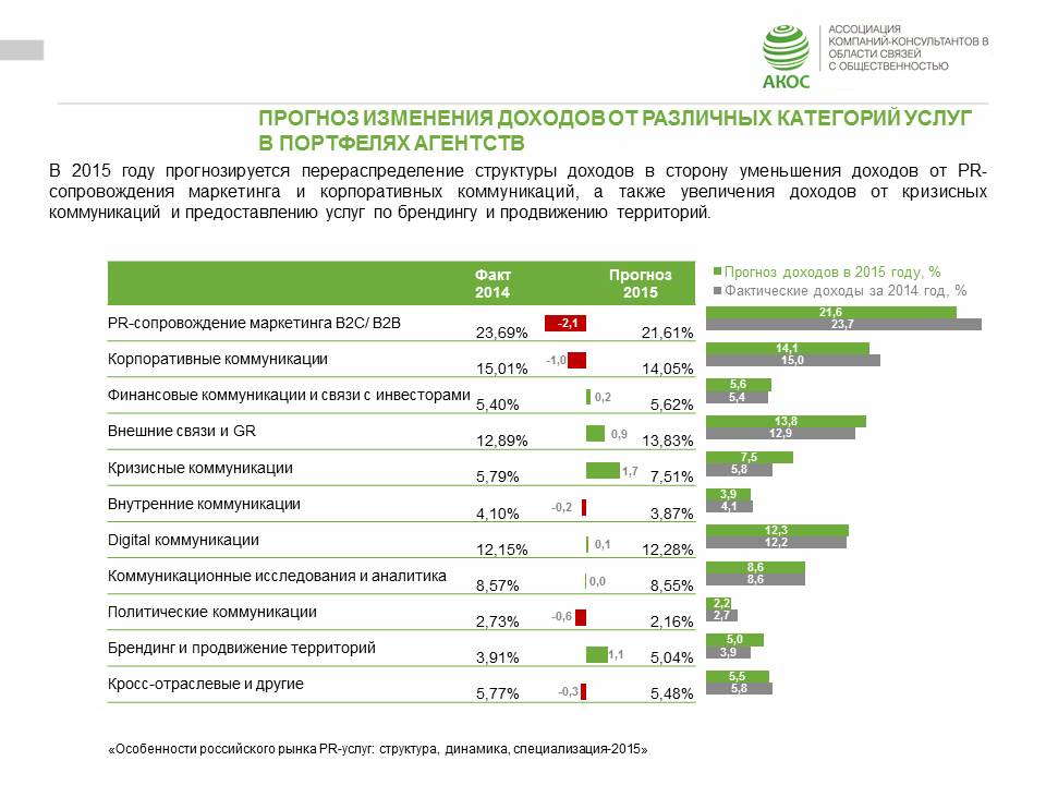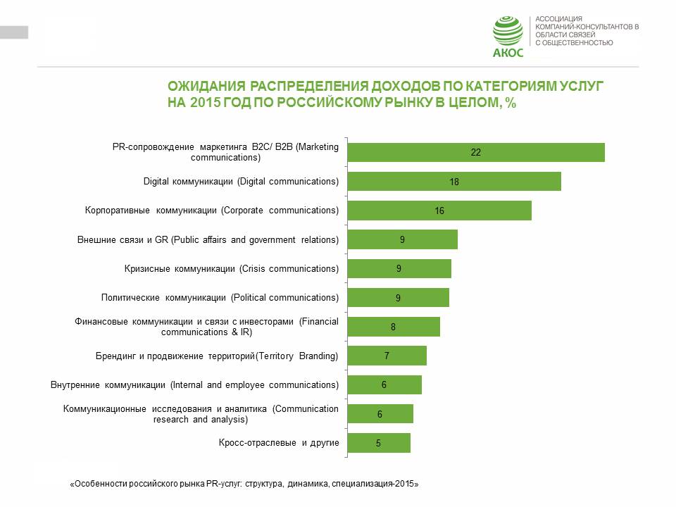 Участники рынка ожидают от 2015 года существенного перераспределения структуры доходов в сторону уменьшения доходов от PR-сопровождения маркетинга и корпоративных коммуникаций, и увеличения затрат клиентов на кризисные коммуникации, внешние связи и GR, а также брендинг и продвижение территорий.