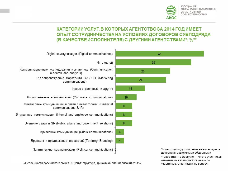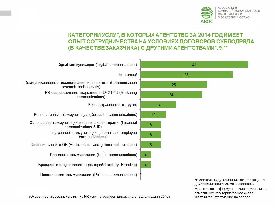 В 2014 году компании респондентов чаще всего привлекали в качестве подрядчика сторонние структуры для реализации работ в сфере Digital коммуникаций, исследований и аналитики, а также marketing communications. Менее всего принято привлекать подрядчиков для политических коммуникаций, территориального брендинга и кризисных коммуникаций.