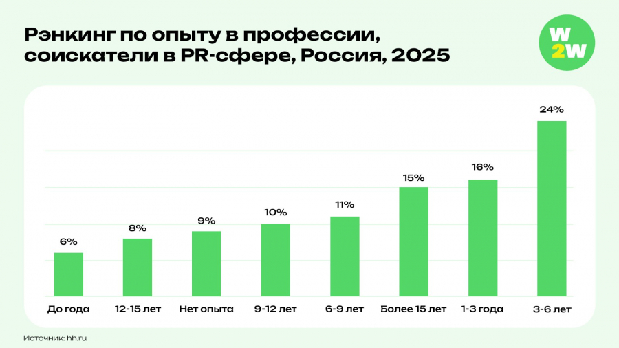 Половина всех активных кандидатов в PR сегодня — это молодые специалисты до 30 лет. У многих за плечами уже 1−3 года реального опыта, часто в агентской среде. Коммуникационные агентства по-прежнему остаются важной школой для начинающих специалистов. Здесь они получают разноплановый опыт, учатся работать в высоком темпе, адаптироваться к запросам разных индустрий и находить нестандартные решения. Именно поэтому так важно, чтобы агентства не только обучали, но и развивали профессиональные стандарты, задавая направление для всей отрасли.