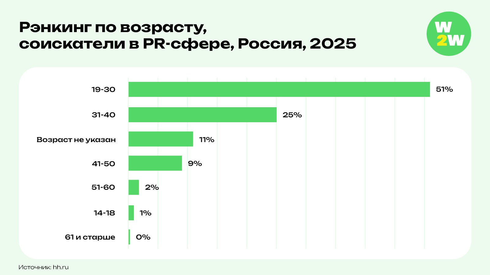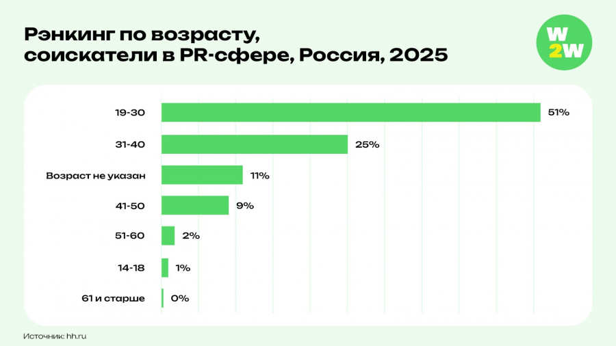 На сегодняшний день 51% всех активных резюме в PR-сфере приходится на специалистов в возрасте от 19 до 30 лет — это более 38 тыс. кандидатов. Возрастная группа от 31 до 40 лет составляет 25% соискателей (почти 19 тыс.), а категория от 41 до 50 лет — 9% (более 6 тыс. человек).