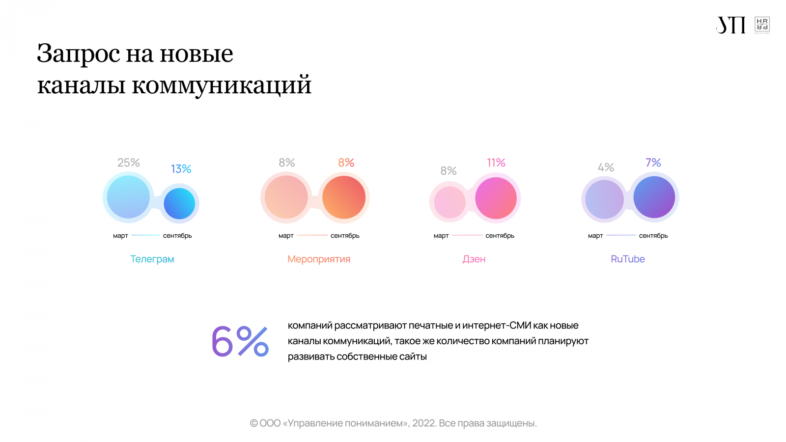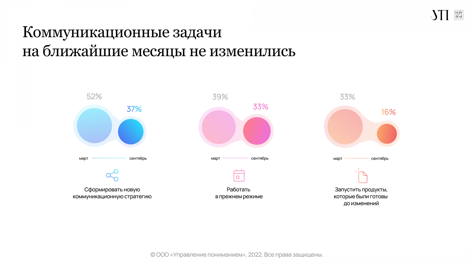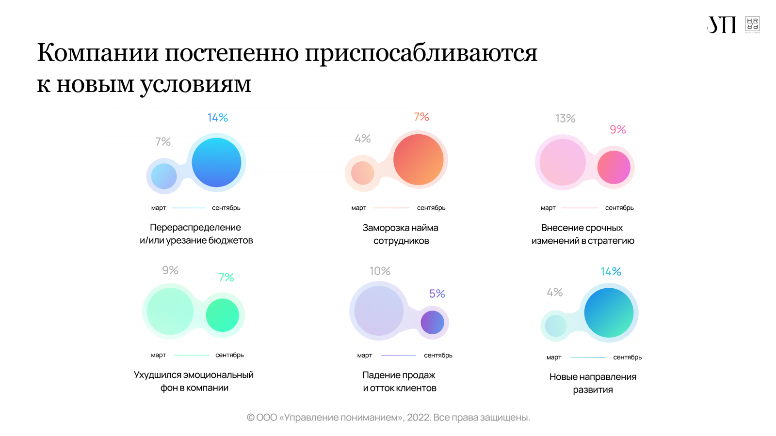 Компании приспосабливаются к изменившимся внешним условиям, констатируют эксперты УП и HR4PR. Внесение срочных изменений в PR-стратегию актуально сегодня только для 9% компаний. До 7% уменьшилось количество организаций, в которых фиксируется ухудшение эмоционального фона сотрудников. В два раза — до 5% — уменьшилось количество компаний, у которых падали продажи и происходил отток клиентов.