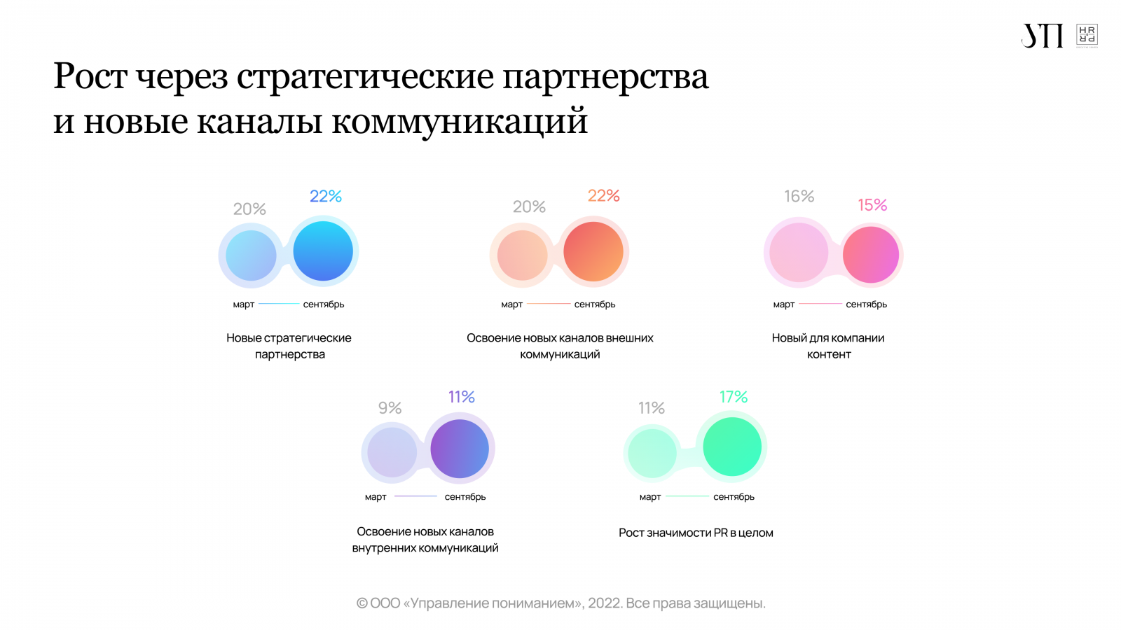 Вместе с изменением стратегических приоритетов в развитии компаний меняются PR-задачи. Новые стратегические партнёрства и освоение новых каналов коммуникаций как главные возможности для роста в PR называют 22% респондентов. Рост значимости PR в целом отмечают 17% опрошенных компаний.