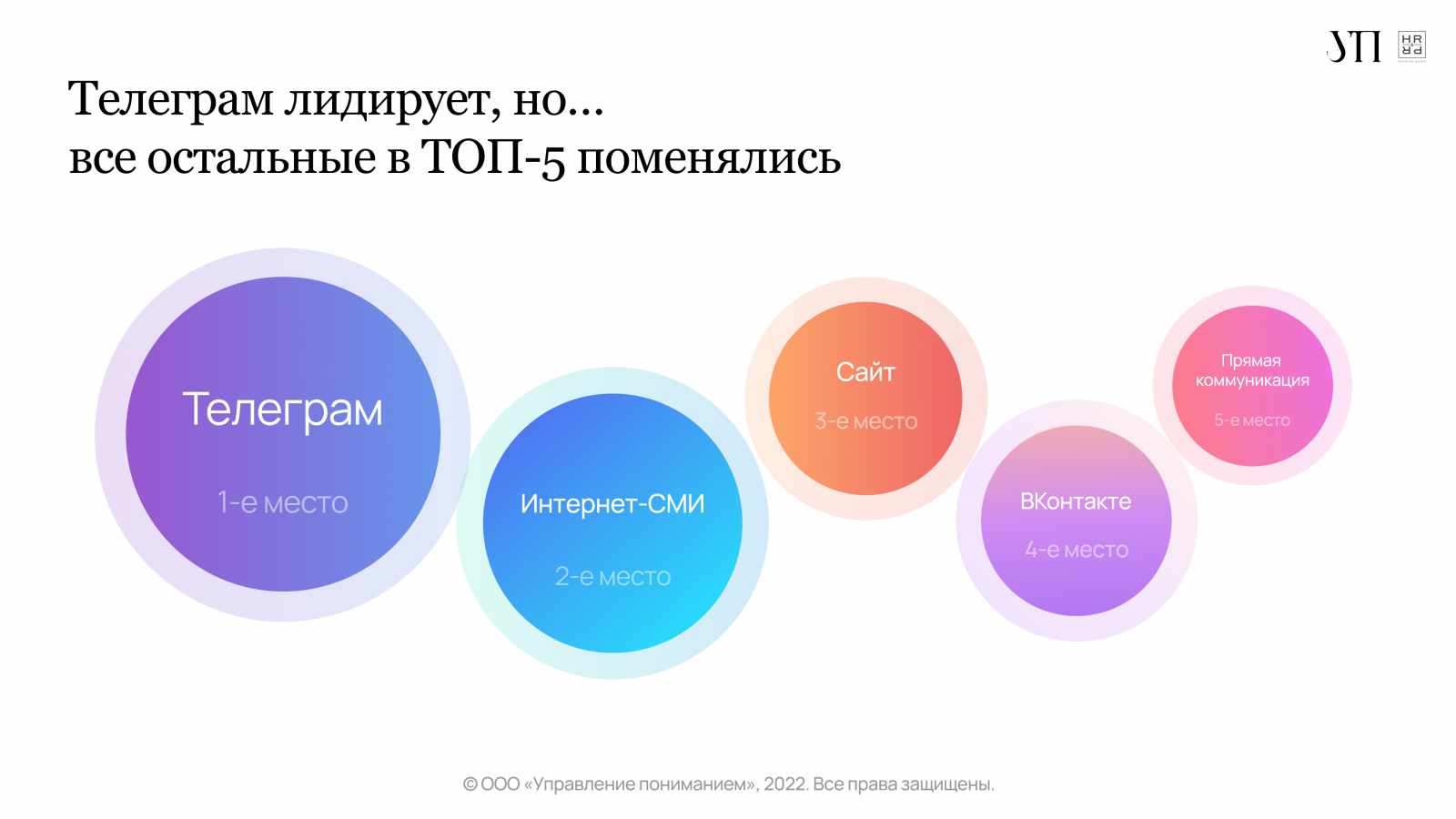 Эксперты УП и HR4PR отмечают, что полученные данные подтвердили тенденцию, наметившуюся в марте: мессенджер Telegram становится «лидирующим и наиболее важным каналом коммуникации для российского PR». При этом представители более половины (52%) компаний заявили, что они впервые начали использовать мессенджер в последние полгода. Ещё 13% респондентов планируют использовать Telegram в будущем.