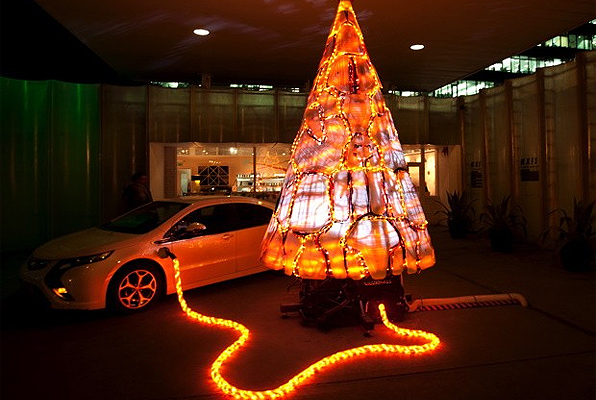 Нечто подобное в 2012 году реализовал в Лондоне автобренд Opel. На улицах города маркетологи концерна установили елки, собранные из запчастей собственных машин. Они эффектно подсвечивались, получая заряд от стоящих рядом электромобилей Opel Ampera.