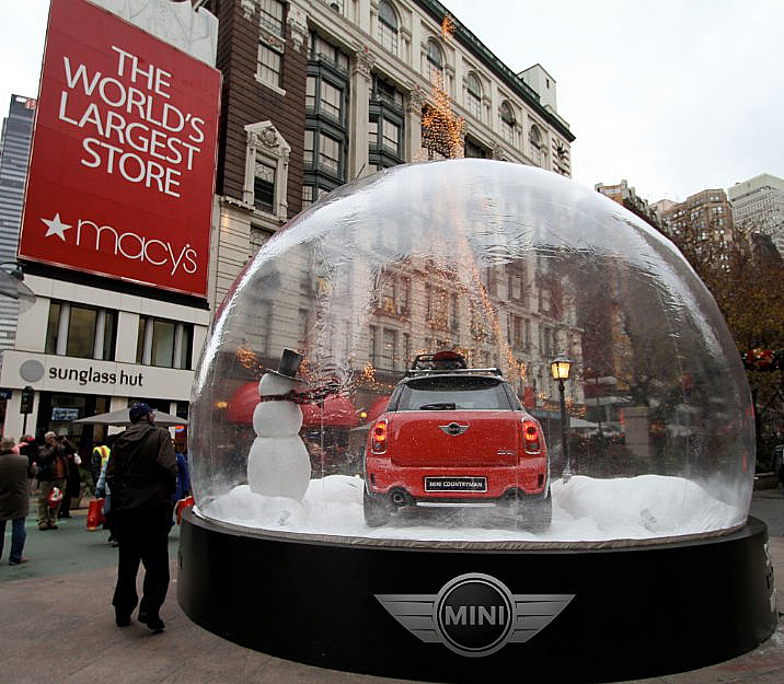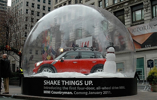 Что еще, кроме нарядной елки, может создавать праздничное настроение на улицах холодных мегаполисов? Конечно же, настоящий снежный шар! Такую «игрушку» команда автомобильного бренда MINI разместила в Нью-Йорке в качестве наружной рекламы. Маркетологи марки предлагали американцам встряхнуться и обратить внимание на новую модель MINI Countryman.