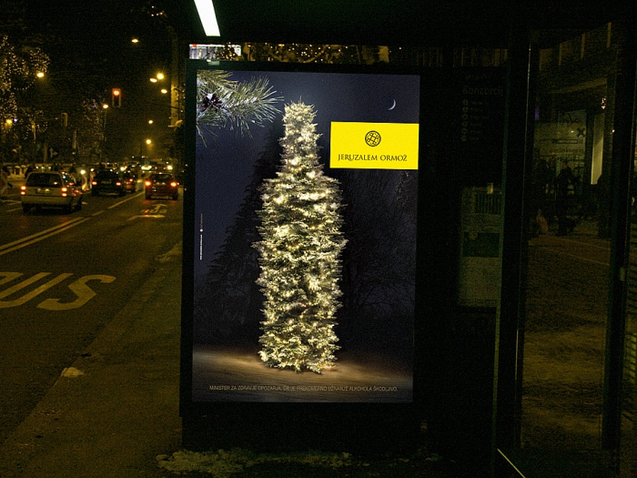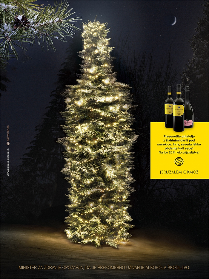 Строгие правила регуляторов не позволяют виноделам открыто рекламировать свою продукцию. Однако, самые креативные из них не упускают возможности оказаться на билбордах в канун Рождества. Например, словенский бренд вина красиво обошел все ограничения, изобразив на рекламных щитах бутылки в виде украшенной огоньками елки.