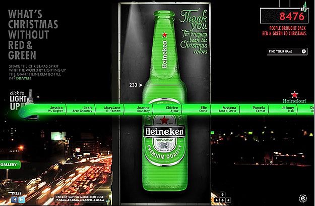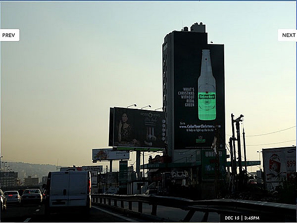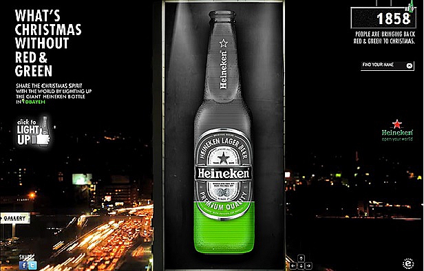 Специально к Рождеству бренд пива Heineken вместе с командой JWT Beirut создал огромный светящийся интерактивный билборд, на котором была изображена 20-метровая черно-белая бутылка. Она состояла из 400 неоновых полосок. В рамках кампании пивовары запустили сайт www.coloryourchristmas.com. На нём пользователей просили зарегистрироваться и помочь «осветить» бутылку перед Рождеством