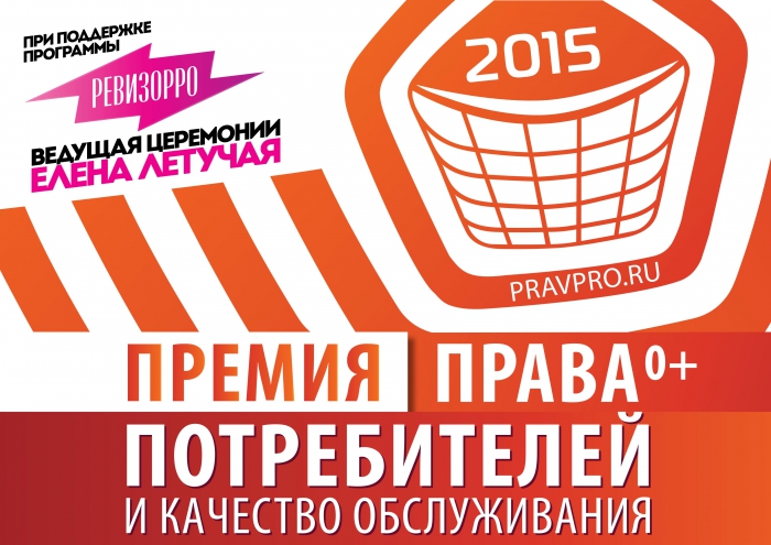 Церемония награждения VI Ежегодной Премии «Права потребителей и качество обслуживания» пройдет 10 июля 2015 года, ведущей мероприятия выступит Елена Летучая – ведущая популярного социального проекта «Ревизорро» на телеканале ПЯТНИЦА: «Мне приятно, что меня пригласили стать ведущей церемонии награждения премии «Права потребителей». Замечательно, когда компании ответственно относятся к соблюдениям прав потребителей, производству товаров и оказанию услуг. Мне бы очень хотелось, чтобы таких компаний становилось в нашей стране больше во всех сферах». – Елена Летучая.