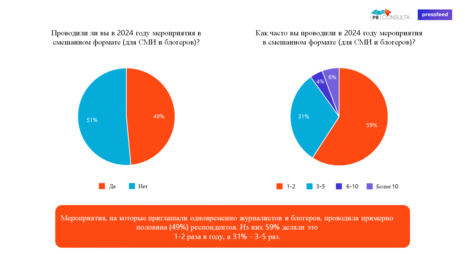 Мероприятия для СМИ проводили больше половины (61%) респондентов, причем в 86% случаев делали это от 1 до 5 раз в году! Мероприятия, на которые приглашали одновременно журналистов и блогеров, проводила примерно половина (49%) респондентов. Из них 59% делали это 1−2 раза в году, а 31% — 3−5 раз. Большинство опрошенных (68%) полагают, что явка на мероприятия для СМИ и блогеров осталась на уровне прошлого года, еще четверть (25%) говорили о ее увеличении. Большинство (67%) проводили мероприятия для журналистов и блогеров офлайн, еще 16% организовывали такие ивенты в гибридном формате.