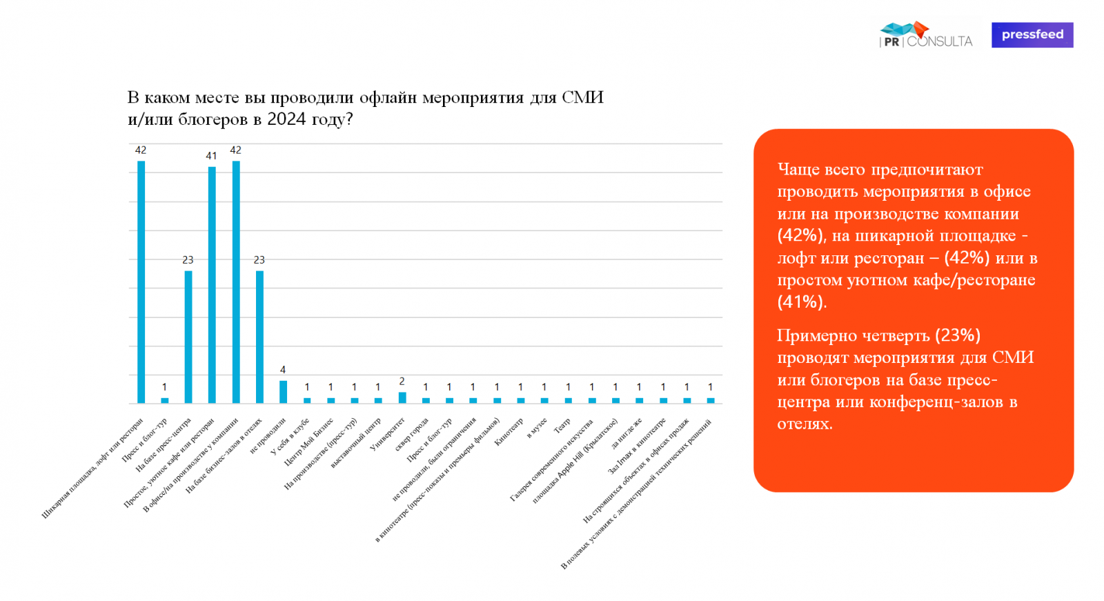 Что касается площадок, где чаще проводятся мероприятия, то больше всего их предпочитают организовывать в офисе/на производстве компании, шикарной площадке или в простом уютном кафе/ресторане. Почти в два раза реже, но тоже часто проходят мероприятия для СМИ или блогеров на базе пресс-центров ИА или конференц-залов в отелях.