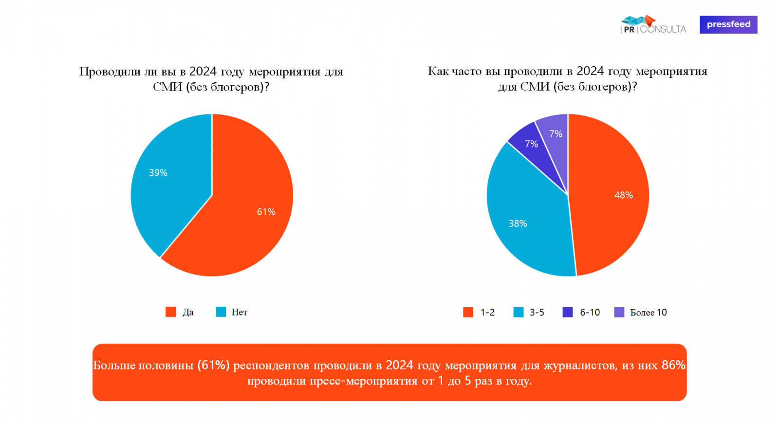 До пандемии мы в агентстве PR-Consulta проводили по несколько пресс-мероприятий в месяц. В ковид все логично перетекло в цифру (помните, был такой Clubhouse?), а после февраля 2022 года и вовсе сошло на нет. В 2024 году многие клиенты стали возвращать в практику мероприятия для журналистов и блогеров. Поэтому мы, коммуникационное агентство PR-Consulta и сервис журналистских запросов Pressfeed, решили проверить, насколько актуален этот инструмент, растет ли количество проводимых мероприятий и явка на них или, наоборот, сокращается, какие форматы востребованы.