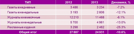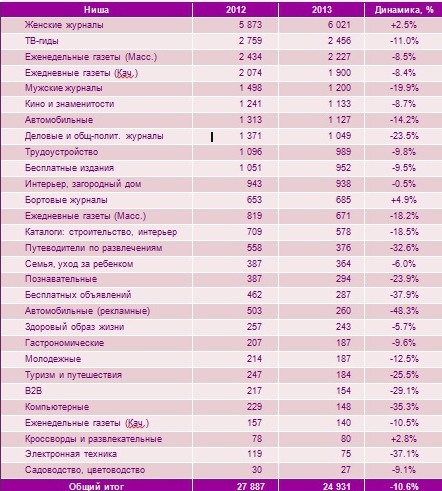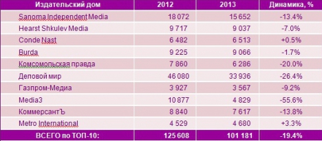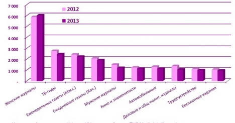 Еще одной тенденцией, явно обозначившейся в 2013 г., стало увеличение числа нерентабельных газет и журналов. Практически каждый месяц из базы данных мониторинга рекламы TNS по причине закрытия удаляется несколько изданий. Однако основные лидеры рынка пока демонстрируют относительную стабильность в доходах, потеряв в среднем в 2013 г. лишь по нескольку процентов от выручки за 2012 г. Доля крупнейших издательских домов продолжает увеличиваться, хотя и не так быстро, как раньше.