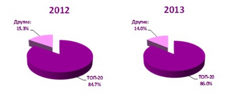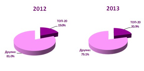 Доля ТОП-20 рекламодателей в общем объеме рекламы в центральной прессе в 2012-2013 гг, %