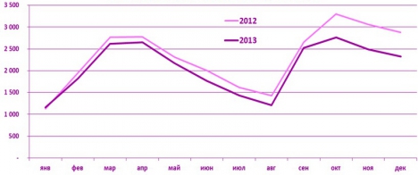 Минувший 2013 год охарактеризовался постепенным ухудшением рыночной ситуации, если судить по ежемесячной динамике рекламных доходов печатных СМИ в сравнении с 2012 годом. Начиная с июня, снижение доходов центральной прессы превысило отметку в 11%.