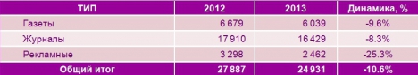Условно-положительным фактором будет являться минимальное количество в прессе рекламы алкогольных напитков в 2013 г. Таким образом, в 2014 г. на показатели динамики уже не будет сильно сказываться ее запрет. А вот запрет рекламы табачных изделий добавит к отрицательной динамике доходов печатных СМИ еще 2-3 процентных пункта. В целом за 2014 г. может быть собрано рекламы на 15–20% меньше, чем в прошедшем году.