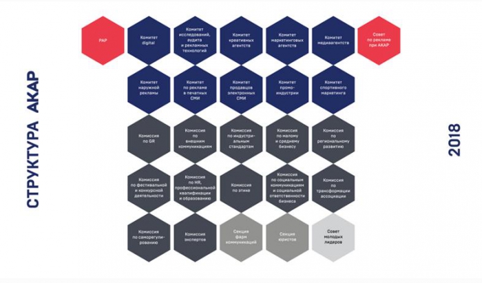 Были названы председатели комитетов и комиссий ассоциации. В частности, сопредседателями комитета наружной рекламы стали Михаил Манжелей («ЛАЙСА»), Жан-Эммануэль де Витт (Russ Outdoor), Алексей Нестеренко (Indoor Group), Александр Эпин (TMG). Комитет исследований аудита и рекламных технологий возглавили Андрей Березкин, («ЭСПАР-Аналитик»), Сергей Веселов (НСК), Илья Герцев (Media Direction Group, Conde of Trade). Возглавлять комитет креативных агентств будут Андрей Губайдулин (РА «Восход»), Игорь Кирикчи (BBDO Group), Владимир Ткачев (Leo Burnett Group Russia). Сопредседателями комиссии по фестивальной и конкурсной деятельности стали Алексей Андреев (Depot WPF), Владимир Филиппов (РА «Аврора») и Илья Герцев (Media Direction Group, Conde of Trade).