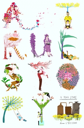 Буквы для L'Occitane представлены в виде людей, которых окружают цветы, деревья, травы и фрукты. Этот природный шрифт Сид Юнг придумал после того, как услышал и проникся историей возникновения фирмы L'Occitane.