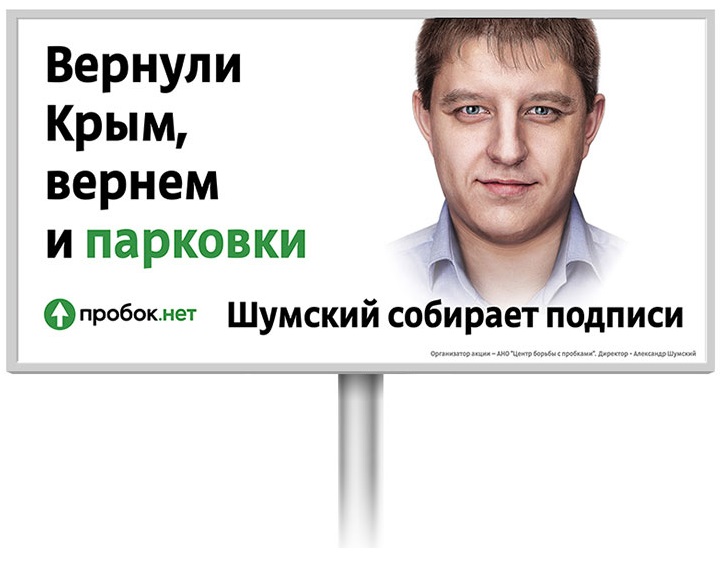 Проект «Пробок.нет» запускает новую рекламную кампанию в поддержку акции «Возврат парковок». В Москве появится несколько сотен билбордов с надписью «Вернули Крым, вернем и парковки. Шумский собирает подписи».