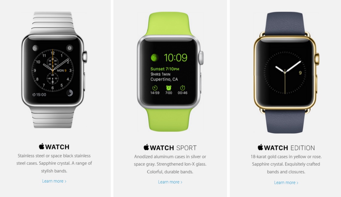 Компания Apple представила три модификации «умных» часов, предзаказ которых начнется 10 апреля текущего года, а продажа — с 24 апреля, сообщается на сайте корпорации. Apple Watch доступны в трех вариантах на любой случай жизни: бюджетная спортивная модель Watch Sport, обычная модель Watch и часы премиум-класса Watch Edition. Каждая из них представлена еще в двух вариантах — с размером экрана 38 и 42 миллиметра.