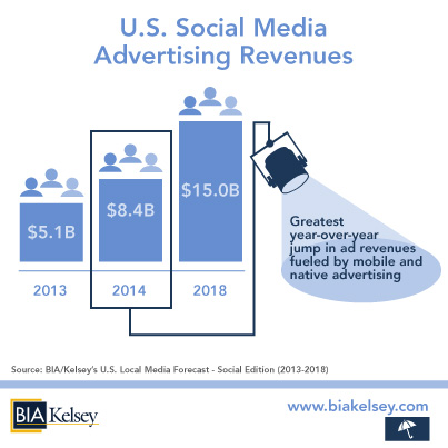 Продажи рекламы в социальных медиа США увеличатся с 5,1 млрд долларов в 2013 году до 15 млрд в 2018-м. Такой прогноз дает консалтинговая компания BIA/Kelsey. В текущем году рынок покажет наиболее заметный рост: ожидается, что его объем достигнет 8,4 млрд долларов. Среднегодовой темп роста составит 24%.