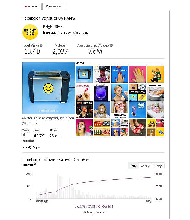 Два проекта российской компании AdMe, развивающей развлекательные проекты 5-minutes craft и Bright Side, вошли в пятёрку самых популярных издателей видео в Facebook, сообщает Tubular in sights.