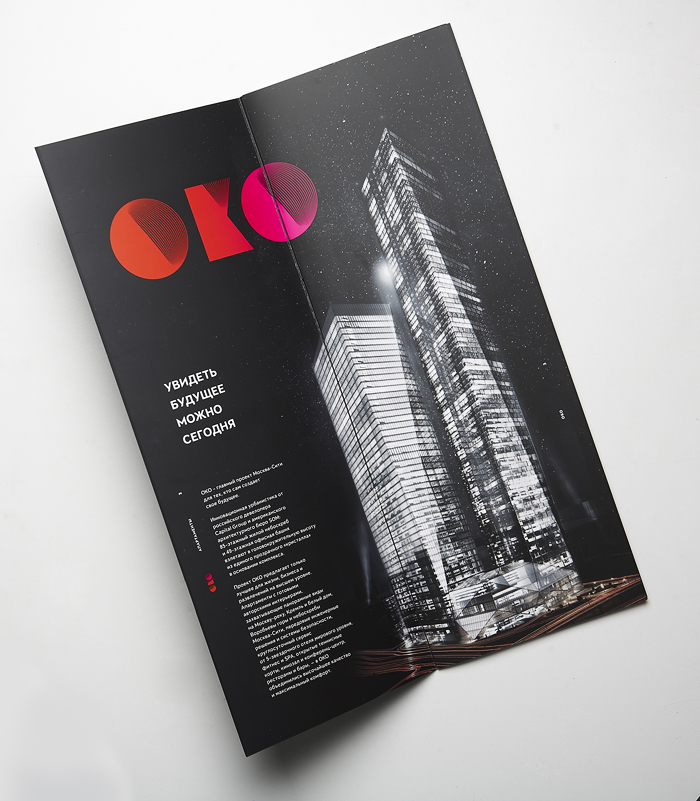 Айдентика и логотип получились яркими и запоминающимися, с авангардной типографикой, перекликающейся с архитектурой башен. Рекламные материалы, выполненные по разработанным гайдлайнам «ОКО», привлекают внимание и запоминаются не только потенциальными покупателями, но и просто жителями Москвы.
