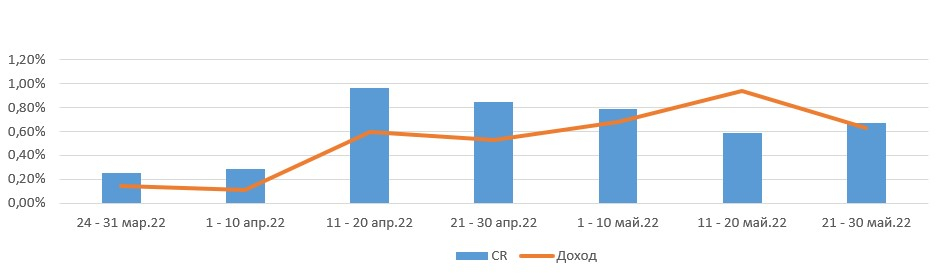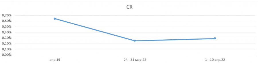 Впрочем, небольшая положительная динамика всё же была. С десятого по двадцатый день кампании CR вырос с 0,25% до 0,29%. К тому же к этому времени ещё не завершилось обучение автостратегии. Так или иначе, полученного результата было явно недостаточно, чтобы компенсировать просадку эффективности, вызванную стремительным падением покупательского спроса с середины марта.