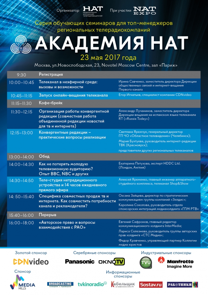 Сформирована программа второго обучающего семинара в рамках Академии НАТ. "Академия НАТ" - это не только тематическая конференция, но и обмен опытом между коллегами из московских и региональных телерадиокомпаний.
