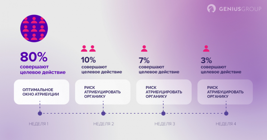 Нет никакого смысла следить за пользователем несколько месяцев или год. В такой ситуации шанс, что именно реклама принесла конверсию, слишком мал. Для post-view анализа ещё на старте устанавливается окно атрибуции — срок, в течение которого все действия пользователя с рекламой и посадочной страницей фиксируются.