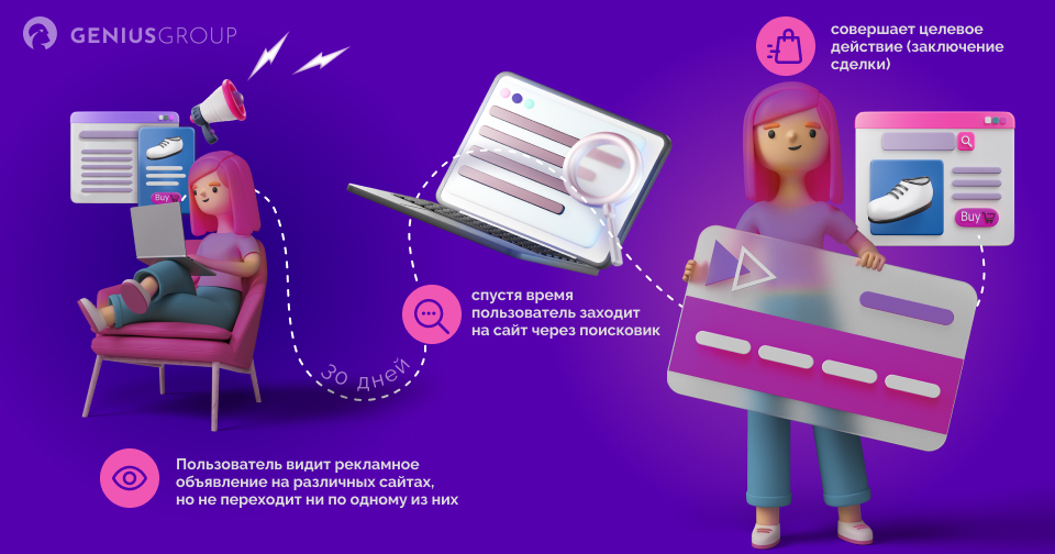 Допустим, человек задумывается о покупке новой квартиры и начинает искать информацию в интернете о ценах на недвижимость и условиях ипотеки. Некоторое время спустя, на одном из сайтов, он видит рекламный баннер нового жилого комплекса с указанием цен за квадратный метр. Ознакомившись с предложением, пользователь покидает сайт. В течение следующих нескольких дней он периодически видит рекламу этого комплекса на других сайтах. Две недели спустя он окончательно решает, что хочет купить новую квартиру и вводит название жилого комплекса в поисковую строку для перехода на сайт.