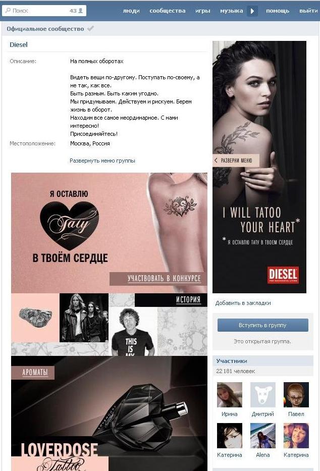Агентство Progression совместно с брендом Diesel компании L’Oreal запустило серию конкурсов в поддержку нового аромата Loverdose Tatoo в своей группе в социальной сети «Вконтакте».