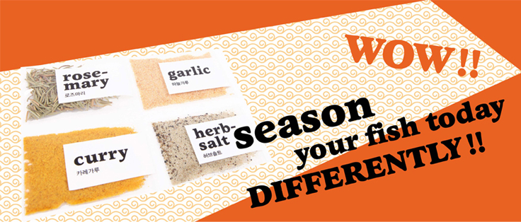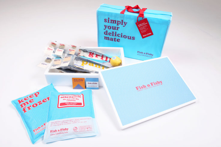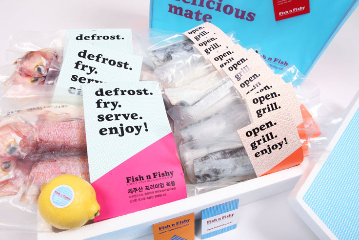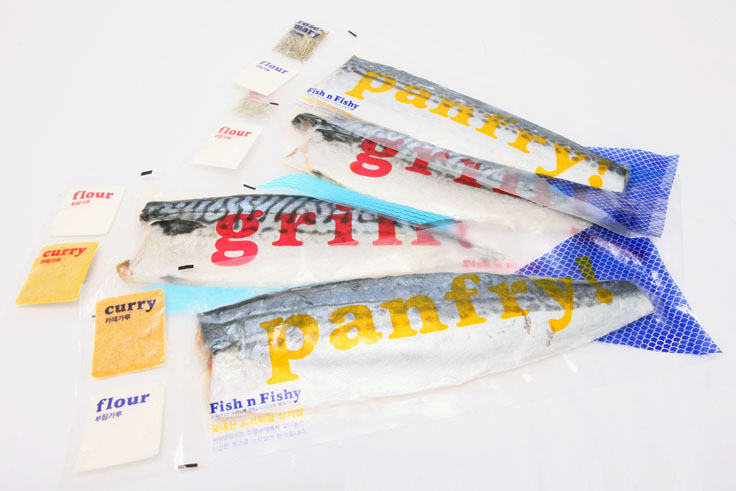 Иллюстраци projecteddy.co.krКаждый продукт «Fish n fishy» имеет свою дизайнерскую упаковку. К примеру, на упаковке замороженной рыбы нарисована чешуя и хвост, а надпись крупными буквами «гриль» является подсказкой для кулинаров как ее приготовить. Тут же представлены и специи, которыми лучше заправить рыбу. Все это аккуратно подписано фирменным цветным шрифтом.