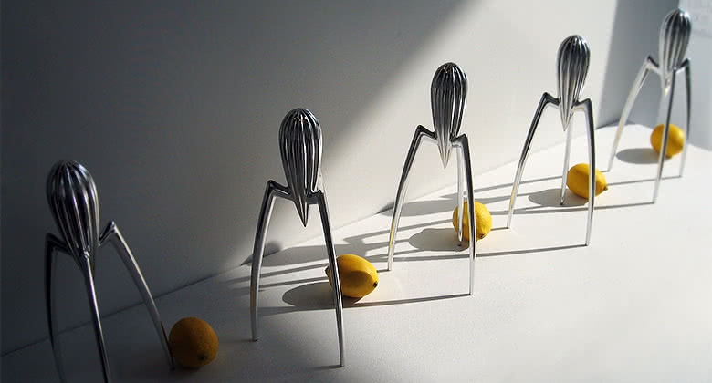 Известно, что функционально это далеко не самая лучшая соковыжималка, но если учесть историю того, как она придумалась и для чего — то всё становится немного проще. Родилась она из контекстной ситуации, которая требовала сок. Однажды Филипп Старк ужинал кальмарами в Италии и обнаружил, что ему не хватает лимона. Дальше произошло пересечение поля лимона, лимонного сока и кальмара — так родилась соковыжималка в форме кальмара.
