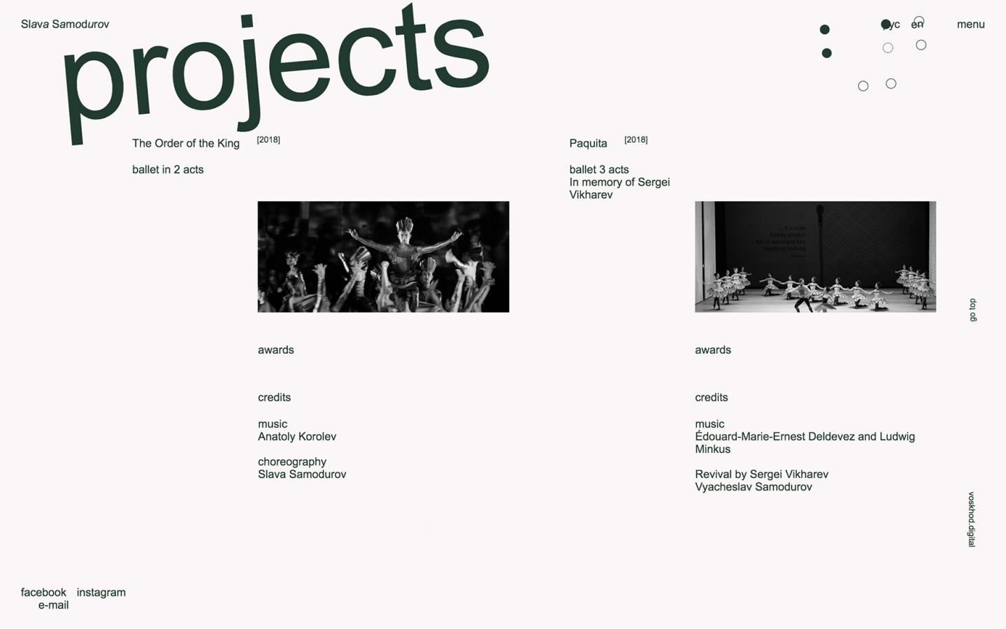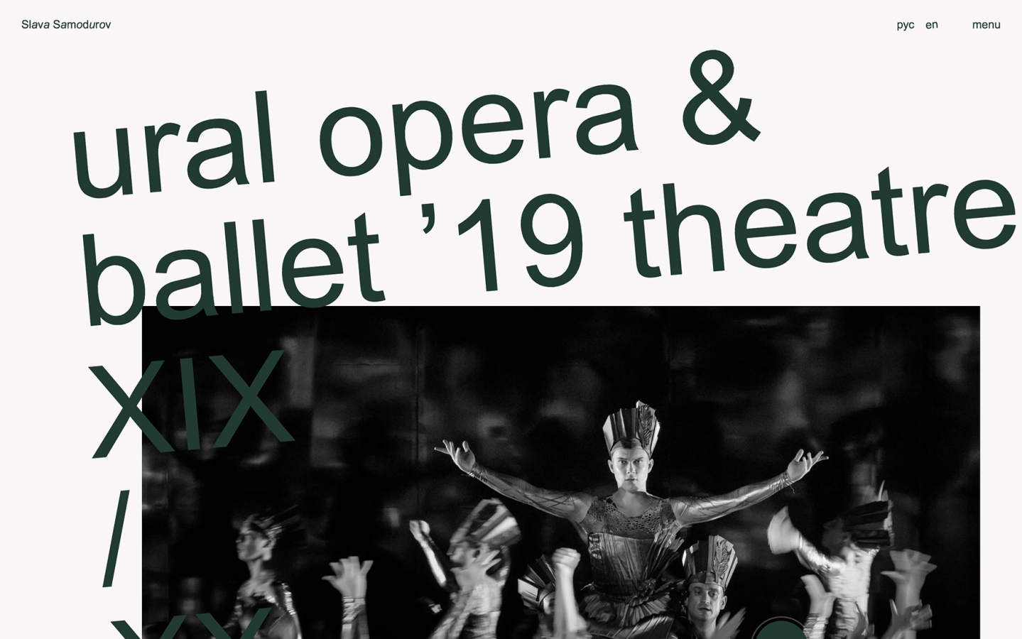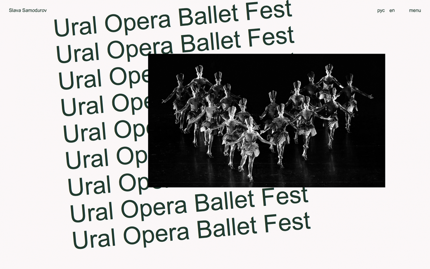 Сайт-презентация хореографа Славы Самодурова метафорично отражает стиль маэстро — компиляции, эксперимент, новое прочтение классики. Слава Самодуров, балетмейстер-новатор, смотрит на имперское искусство танца через призму 21 века.