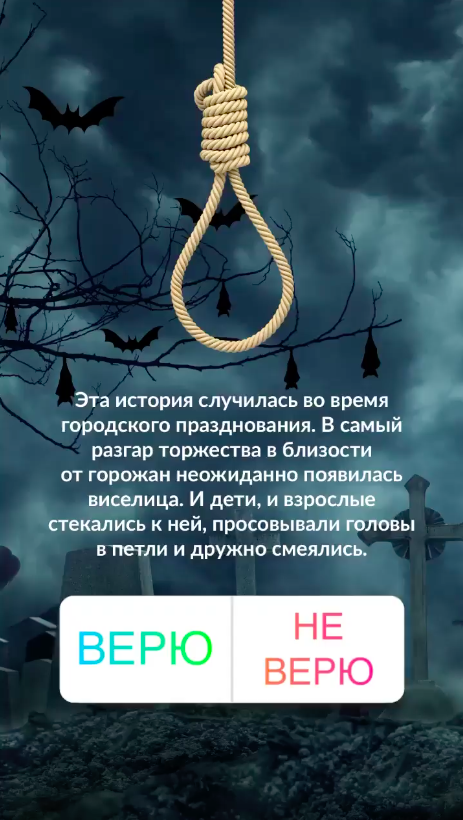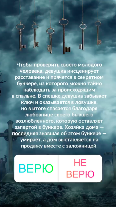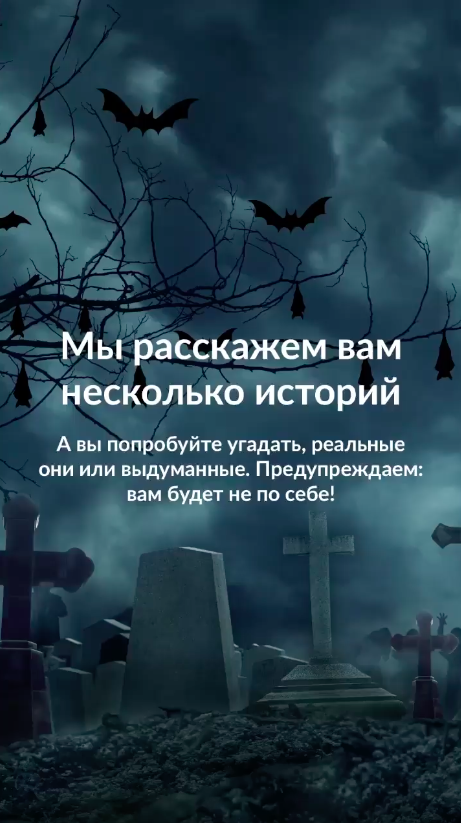В серии интерактивных Stories рассказываются странные и немного пугающие события, которые однажды случались — в жизни, в кино или в городских легендах. Подписчикам предлагалось угадать, что было на самом деле, а что выдумка.