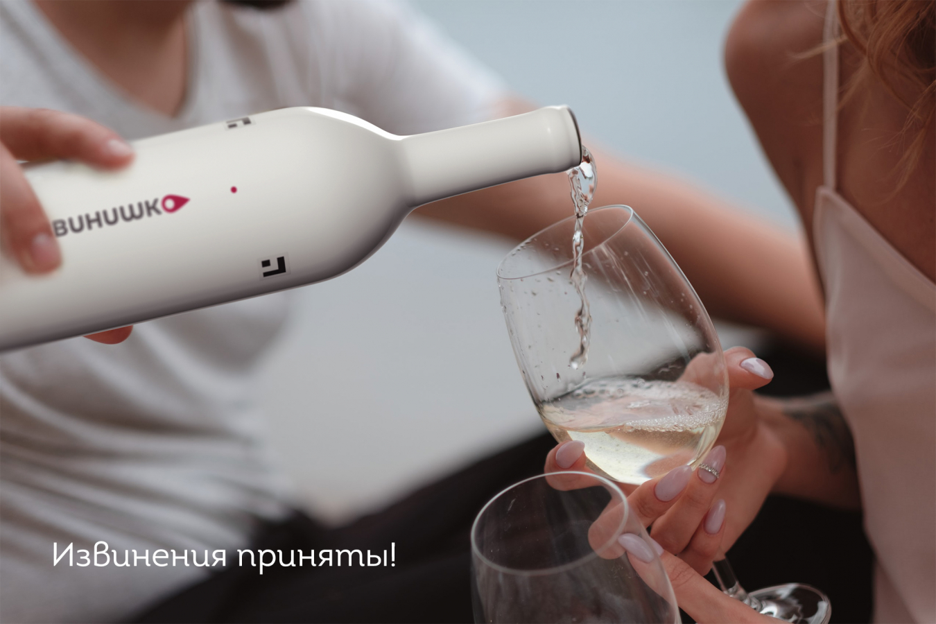 Мобильный сервис «Извинишко» — это проект, придуманный для Fakestival. В нем пользователь может выбрать вино, дополнить его AR-наклейкой с эпичным подвигом-искуплением и отправить адресату. Стикер с дополненной реальностью расположен на этикетке с вином. Если наклеить его на окно и навести камеру, то откроется романтичный вид.