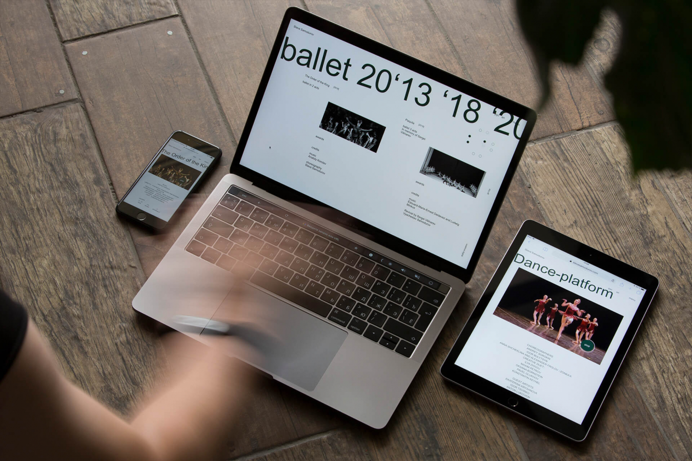 Особая айдентика пунктуации становится аллегорией нотных записей. А динамичный элемент загрузки — аллюзией на схему записи танца. Брутальная плакатная вёрстка и наклонный напористый шрифт очень точно отражают характер хореографа — упорный и целеустремленный.