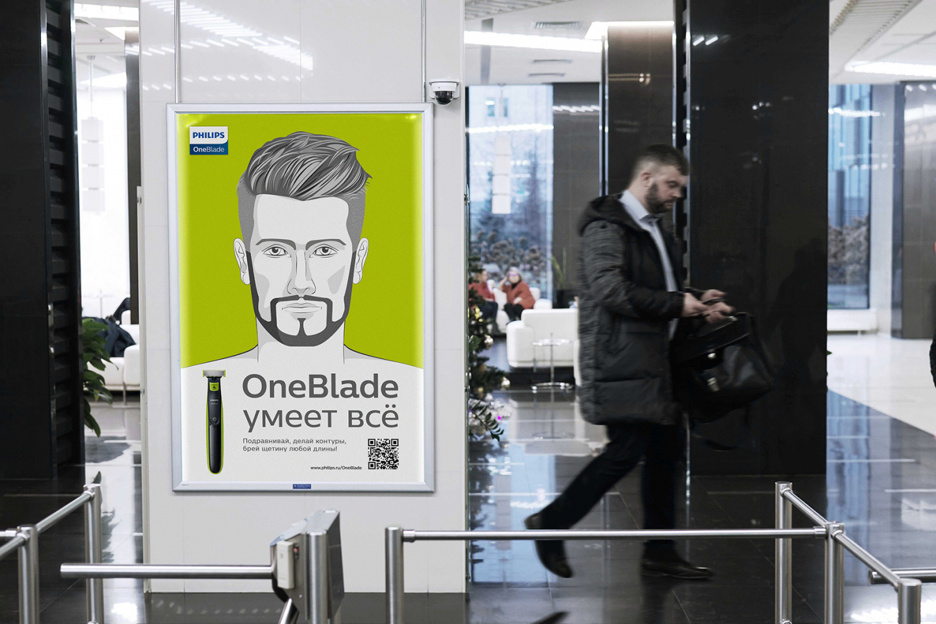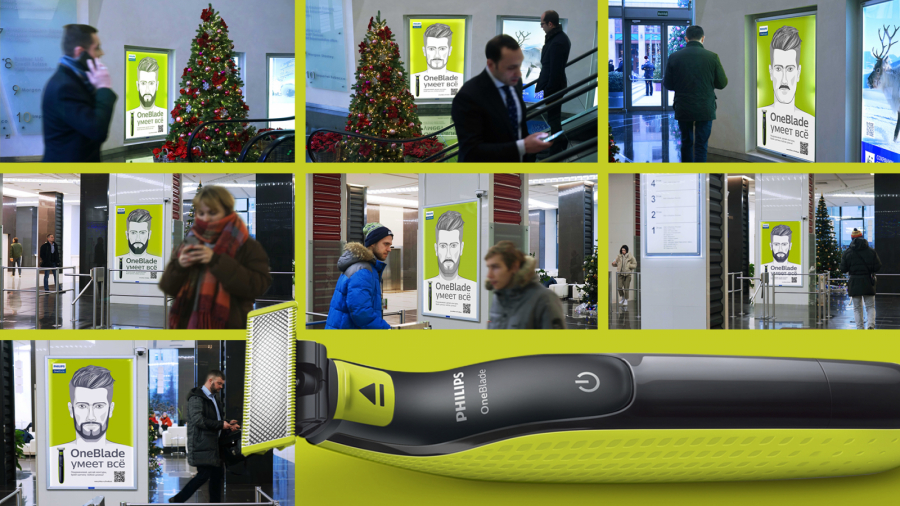 Для декабрьской кампании была сформирована программа со световыми конструкциями indoor-оператора Advance Group в бизнес-центрах Москвы класса не ниже B+. Специально для проекта были изготовлены постеры на лентикулярной линзе в формате stereo vario, передающие эффект объема и анимации. Макет включает четыре изображения разных стилей мужской бороды, сменяющих друг друга в зависимости от угла зрения и демонстрирующих функционал Philips OneBlade 3-в-1 для подравнивания, создания контуров и бритья щетины любой длины.