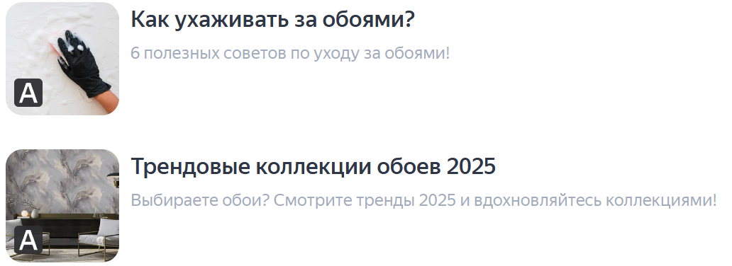 - «Проблемы с интерьером? Вот решение…» — разбор типичных ситуаций и соответствующих серий обоев/товаров для дома.
