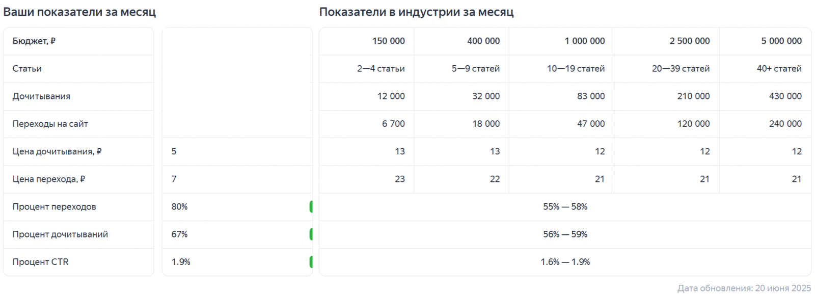 Поиск в категории клиента — один из самых конкурентных каналов, CPC высок, а окупаемость «с коротким плечом» не всегда предсказуема. За период с 24.05 по 06.08 мы получили ~68−70% дочитываний при стоимости дочитывания ~4,8−5 руб. и цене перехода на сайт ~6 руб. — ниже отраслевых бенчмарков.