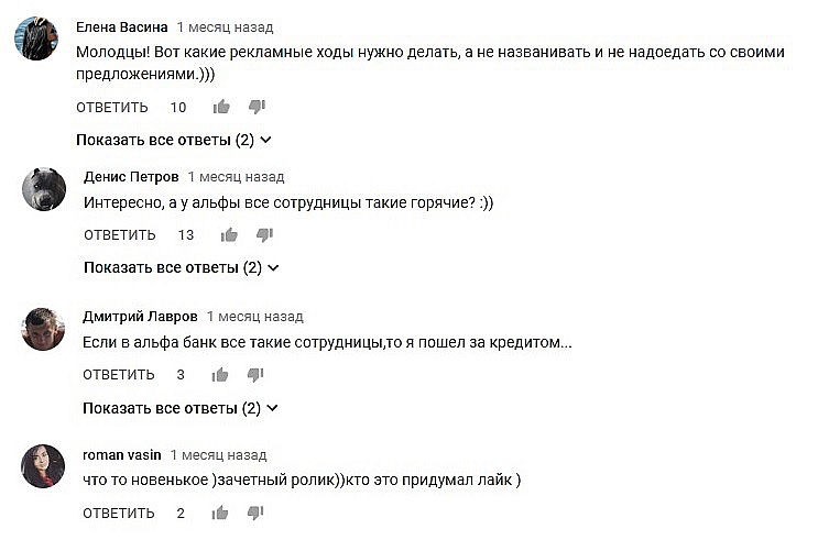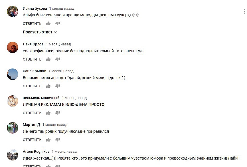 «Альфа Банк – бренд-экспериментатор. Мы всегда ищем новые формы в коммуникации и нестандартные для банковской категории подходы. Мы были приятно удивлены положительным откликом аудитории на этот ролик и открытостью Интернет сообщества к нашим экспериментам в области креатива», – добавляет Наталья Бижанова, руководитель по стратегическому маркетингу Альфа Банка.