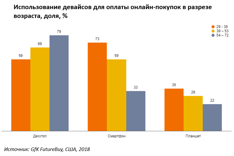 Но потенциал роста у российского рынка электронной коммерции есть. В США, начавших цифровизацию значительно раньше, больше половины покупателей уже используют смартфоны для онлайн-покупок. И здесь уже становятся заметны возрастные зависимости. Несложно предположить, что люди старшего поколения более консервативны и реже пользуются смартфонами. И, действительно, это подтверждается данными проекта FutureBuy компании GfK.